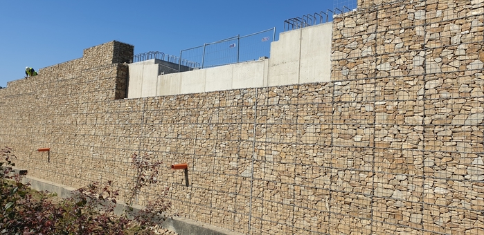 Gabionový obklad nabízí jednoduchý systém pro obložení opěrných stěn, soklů nebo jiných stávajících staveb. Gabionové sítě se připevní na stávající stavbu pomocí speciálních kotev, které mají vysokou nosnost a odolnost. Celý systém může fungovat již od 10cm šířky s použitím sypaných kamenů a použitím sítě s velikostí oka 2,5 x 10cm. Díky variabilní hloubce je možné i sjednotit různé odskoky plotů, soklů nebo opěrných zdí.